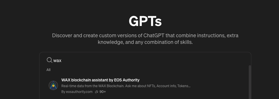 Open https://chatgpt.com/g/g-lDdr7dzKK-wax-blockchain-assistant-by-eos-authority and start asking your questions. Please note that OpenAI is releasing their store to all users gradually and non-plus users should all have access in a week or two.