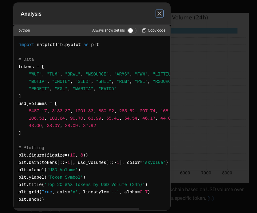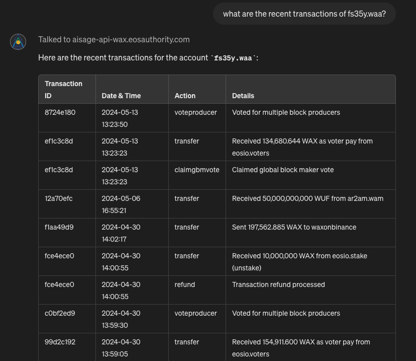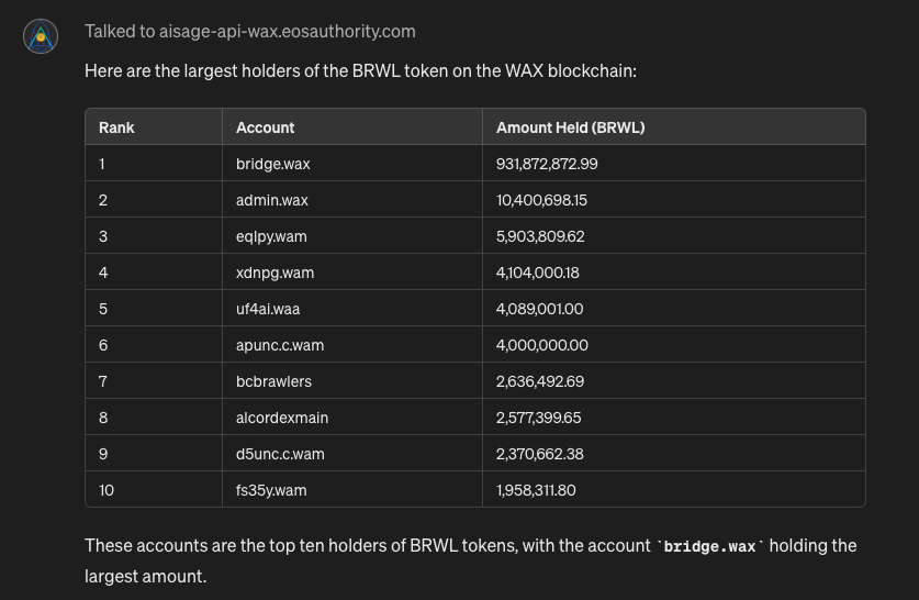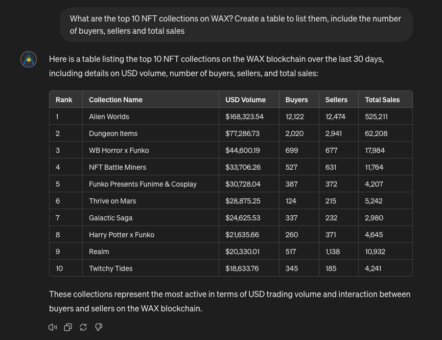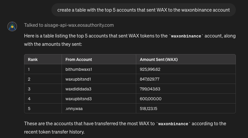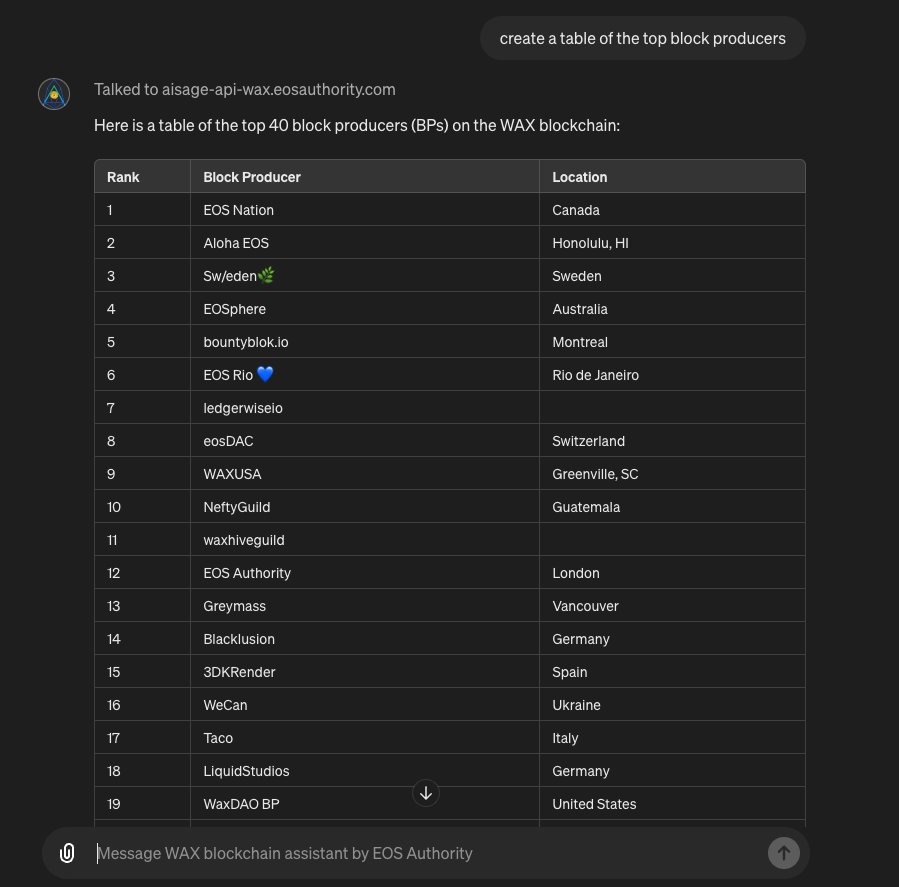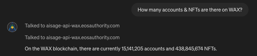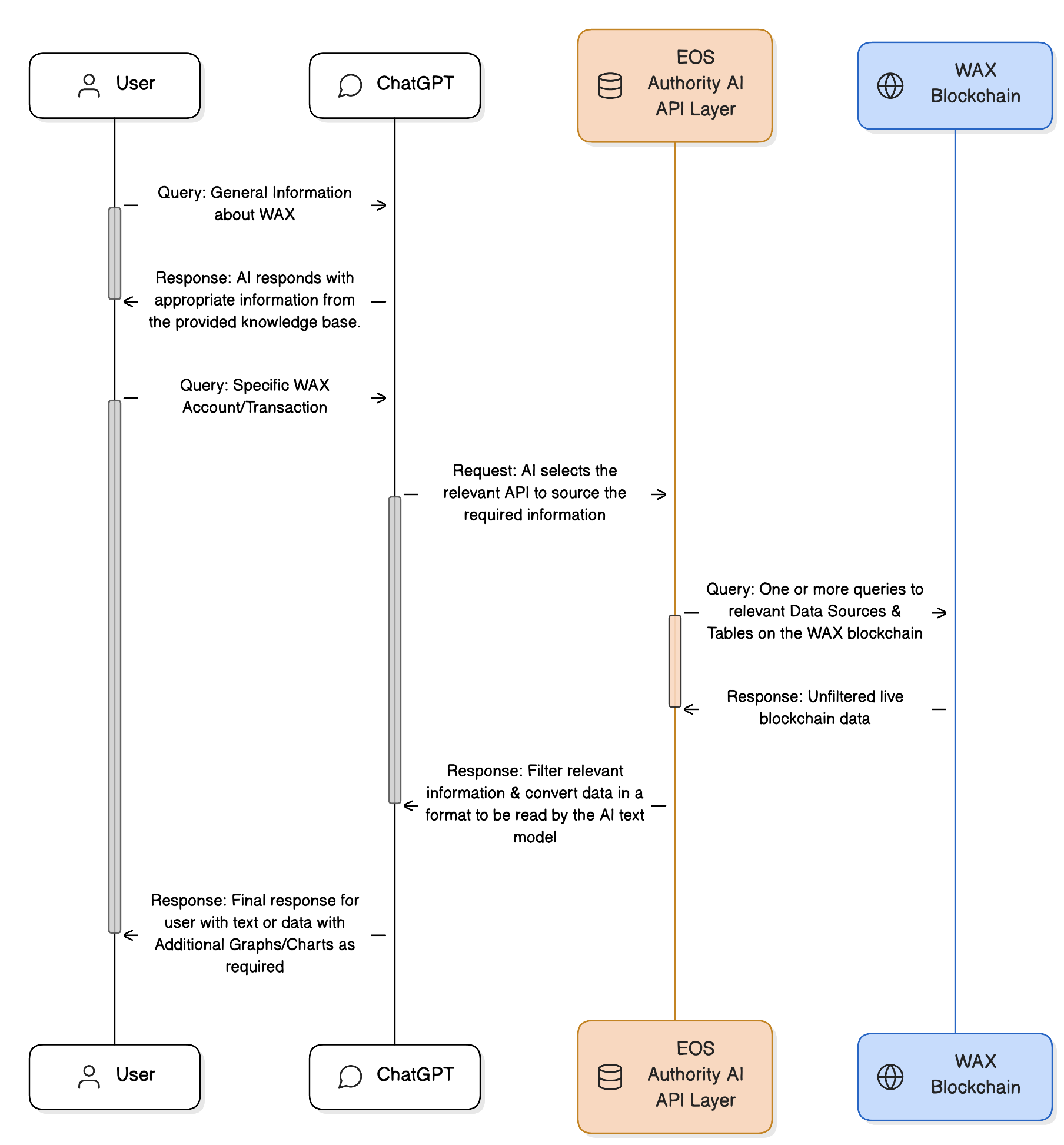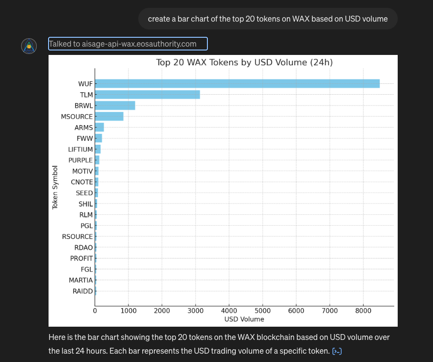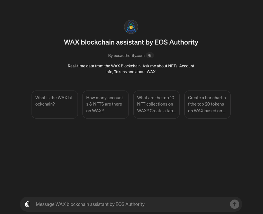 The EOS Authority team has developed the first custom WAX ChatGPT, enabling users to pose their questions and receive live data directly from the blockchain. The WAX GPT system is specifically designed to assist users with a wide range of inquiries related to the WAX blockchain, including general questions and real-time data analysis. Responses can be provided in various formats such as text, tables, and charts, based on the data. Additionally, the ChatGPT AI system can generate custom Python code, which can be used to analyse and combine data from multiple EOS Authority API calls.